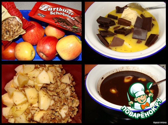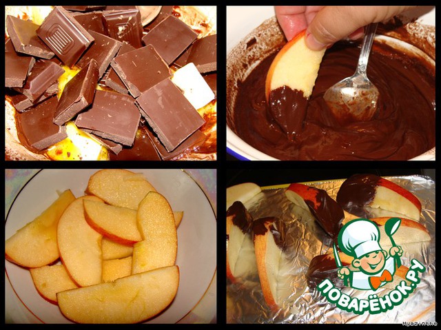 Отложенное яблочко режем на красивые дольки и полдольки окунаем в горячий шоколад.
