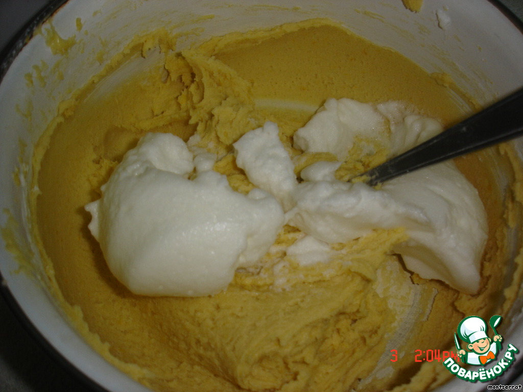 замесить тесто, постепенно ввести взбитые белки, осторожно перемешивая снизу вверх.