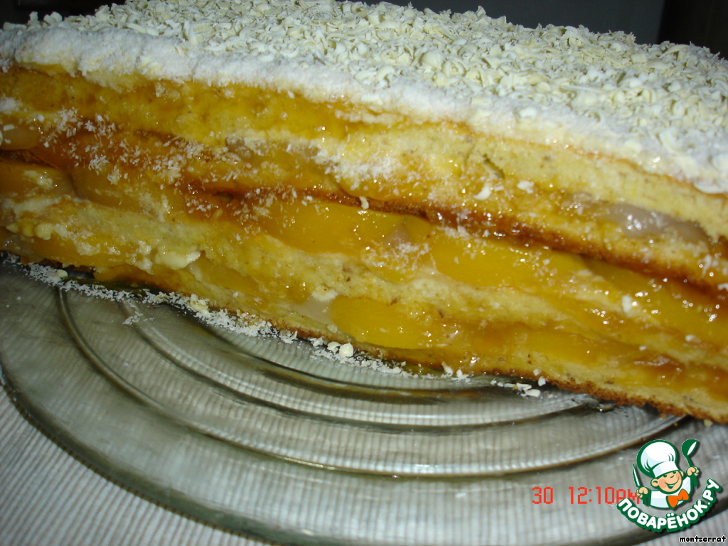 Персиковая начинка хорошо сочетается с масляным кремом, торт достаточчо легкий и вкусный.