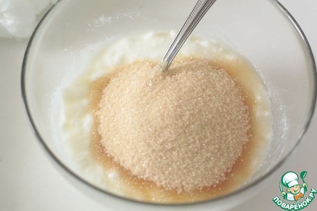 Займемся йогуртовой заливкой - соединим йогурт и сахар, перемешаем до растворения сахара.