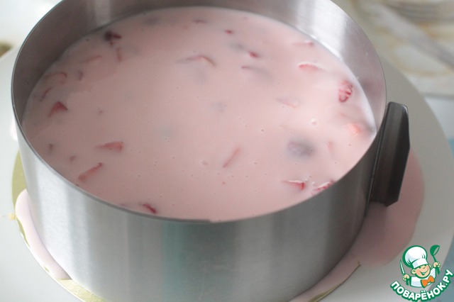 Дальше я сделала большую ошибку, за которую поплатилась. Разъемное кольцо надо поставить на 1 см. шире, чем бисквит, но я понадеялась, что оно плотно прилегает и масса не будет вытекать, увы, чуда не случилось. Поэтому застелите внутри форму пищевой пленкой и на нее вылейте йогуртовую смесь. Если вы хотите сделать тортик розового цвета, как у меня, то нужно добавить 2 грамма розового пищевого красителя.