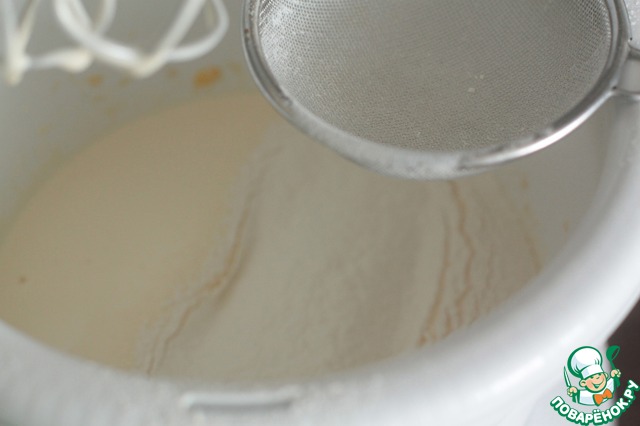 Просеиваем муку с разрыхлителем и аккуратно перемешиваем. Здесь хочу сказать, что сколько я ни старалась, у меня не получается перемешать лопаткой аккуратно сверху вниз, все равно мука оседает и бисквит становится более резиновый. Для тех, у кого такая же проблема, может пригодиться мой способ, я вмешиваю муку на самых низких оборотах миксера - 3 круга.