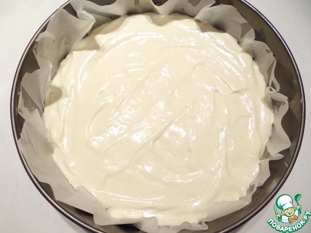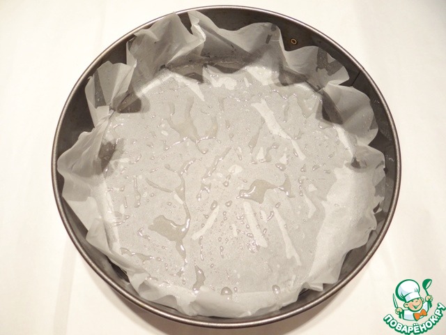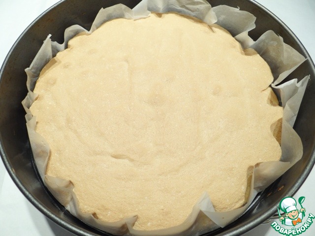 Бисквит помещаю в форму, делаю бортики из пергамента, выкладываю на бисквит рисовую прослойку и убираю в холодильник примерно на 1 час.