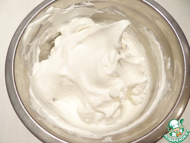 Готовлю бисквит. Желтки отделяю от белков. Холодные белки взбиваю со щепоткой соли до устойчивых пиков, постепенно добавляю сахар.