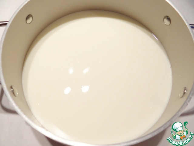 Готовлю рисовую прослойку. В кастрюлю наливаю молоко, добавляю сахар. Довожу молоко на плите до кипения.