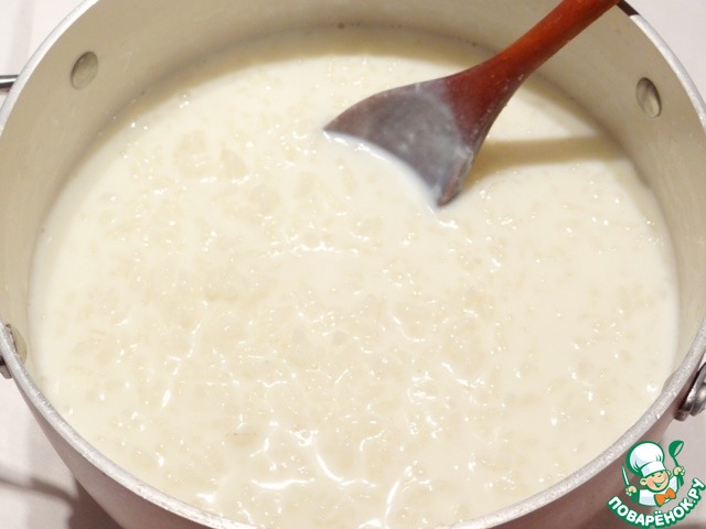 В кипящее молоко засыпаю промытый рис, убавляю огонь до минимального, закрываю кастрюлю крышкой и готовлю рис примерно 25 минут, периодически помешивая.