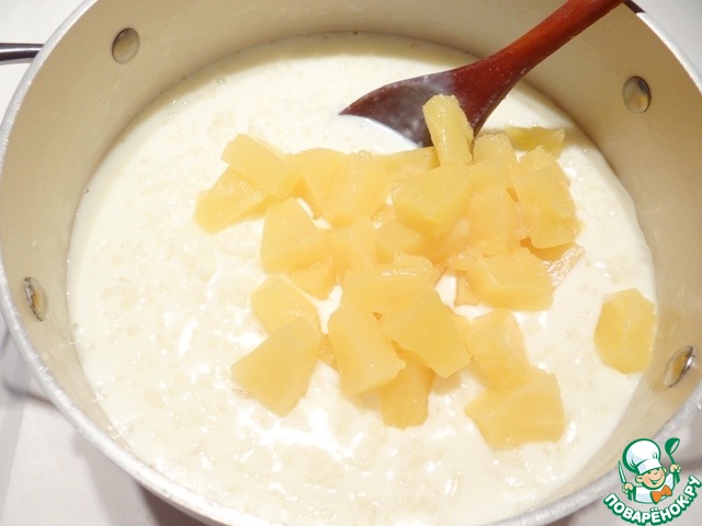 Добавляю в рисовую кашу кусочки консервированного ананаса, перемешиваю и снимаю кастрюлю с огня. Оставляю кашу остывать при закрытой крышке.