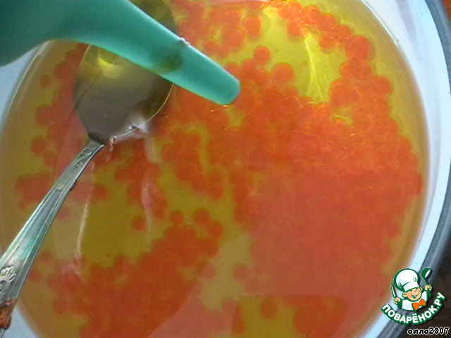 Берем новою спринцовку. Горячее желе набираем в спринцовку и капаем в масло на расстоянии 3-5 см. Очень быстро получается.