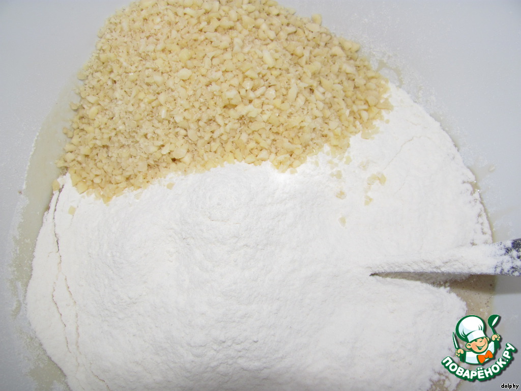 Вмешайте ванилин. Затем просейте сверху муку, соду и разрыхлитель. Добавьте миндаль и осторожно вмешайте в яичную массу.