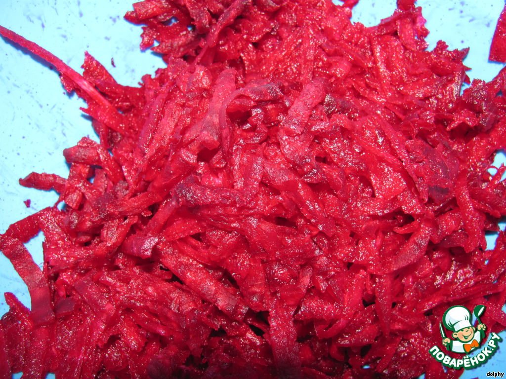 Свеклу очистите и потрите на терке. Отожмите лишнюю жидкость. Постарайтесь тщательно отжать сок, иначе бисквит долго не сможет пропечься.