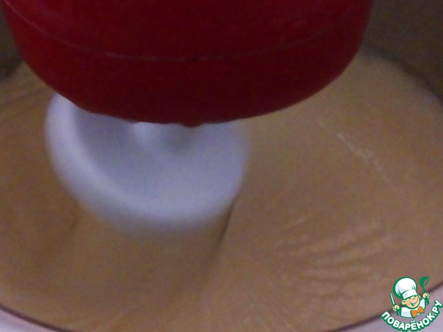 Пока бисквит выпекается и остывает, приготовим крем. Хорошо взбить вареную сгущенку с маслом.