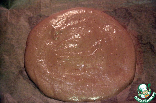 Духовку разогреваем до 170гр., на бумаге для выпечки рисуем круг 24 см, делаем первый корж и отправляем на 15-20 минут в духовку. Из такого объема теста у Вас должно получиться 3 коржа.
