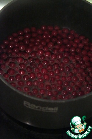 Готовые коржи остудить на решетке. Пока готовятся коржи, воду (100мл.) смешайте с сахаром (100гр.) и сварите сироп, залейте им 100гр. смородины. Эрме рекомендует оставить смородину на ночь, но у меня времени не было, я использовала ее через пару часов.