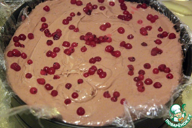 Начинаем собирать торт. Разъемную форму выстелить пищевой пленкой, выложить вниз корж, сверху выкладывайте крем и ягоды смородины. Так собираете полностью торт и отправляете на ночь в холодильник.