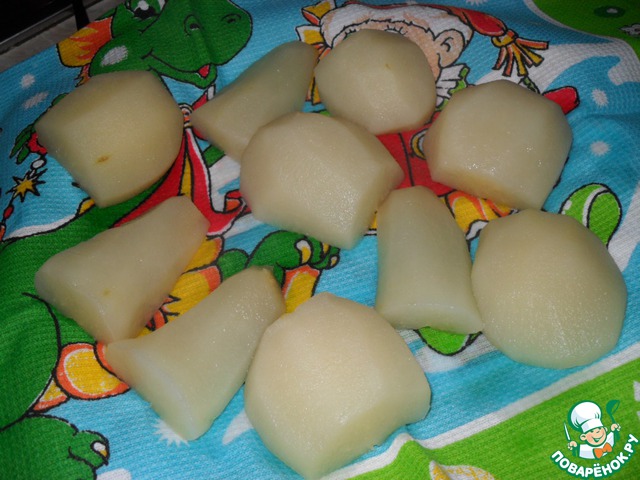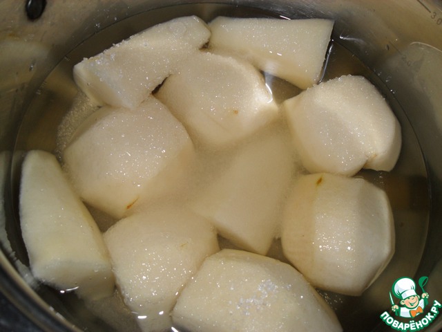 Готовые груши выложить на салфетку, чтобы стекла лишняя жидкость. Затем порезать груши на дольки шириной 2-3 см.