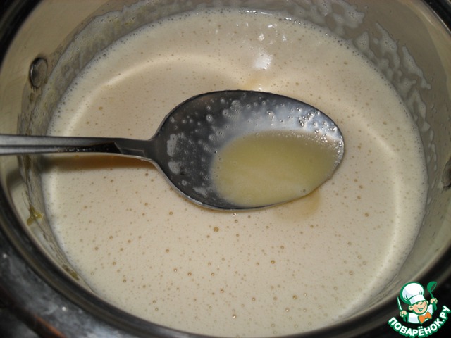 Поставить полученную массу на огонь и уварить до загустения. Не кипятить. Масса сильно не загустеет, поэтому, когда на поверхности будет оставаться более-менее четкий след от ложки - пора снимать. Затем добавить отжатый желатин. Остудить до комнатной температуры и ввести 400 мл взбитых сливок.