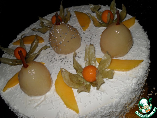 Сливочный крем: Взбить 200 мл сливок с 80-100 г сахара и смешать с 200 г маскарпоне. Готовый крем выложить в форму диаметром 20 см, сверху уложить груши, вдавливая их в крем, и убрать в морозильную камеру до полного застывания.