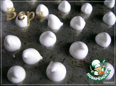 чайной ложечкой отсадить маленькие безешки на противень и подсушить в духовке на самом маленьком огне.