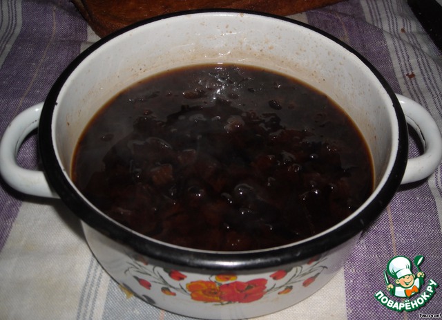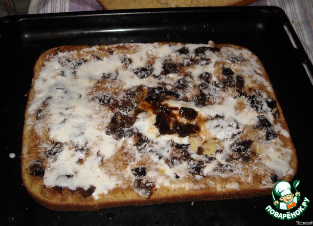 Берём белую половинку коржа, поливаем сиропом от чернослива, выкладываем 1/4 чернослива и смазываем всё это сметанным кремом.
