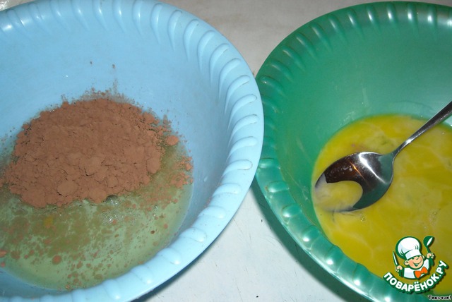 В каждый тазик добавляем по 0,5 ст. сахара, по 0,5 ст. сметаны, по 1 ч.л. соды, по 1 ст. муки. Всё это хорошо вымешиваем и ставим выпекать два коржа.