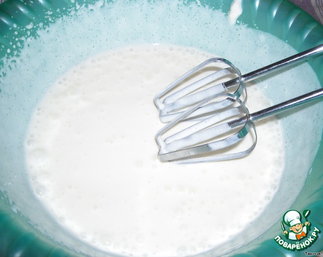 Пока пекутся наши коржики и варится сироп, мы взбиваем сметанный крем.(2ст.Сметаны + 1ст. сахара)