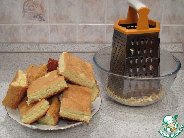Измельчить подсохший бисквит в крошку, натерев на терке.
