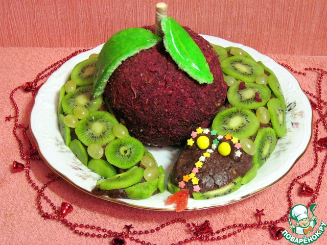 | Основу данной композиции составляет торт «Райское яблоко». Когда-то давно вырезала заметку с рецептом из журнала. Очень красиво смотрелось яблоко и способ приготовления торта мне показался достаточно простым. Готовится он из бисквитных крошек, связывающее звено - повидло. Помадка, которой покрывается яблоко, проникает в крошки на 1 см и окрашивает их в бордовый цвет - получается очень красивый эффектный разрез, по виду напоминающий настоящее яблоко. История моей композиции такова. Приготовив торт «Райское яблоко», я начала думать, как его преподнести, но ничего интересного в голову не пришло. И тут в магазине я увидела символ года - змею, которая плотным кольцом обвилась вокруг яблока. Идея сразу же родилась в моей голове. Я попыталась воплотить ее в моем кулинарном творении. И вот, что у меня из этого получилось. Эта композиция украсит Ваш праздничный новогодний стол. |