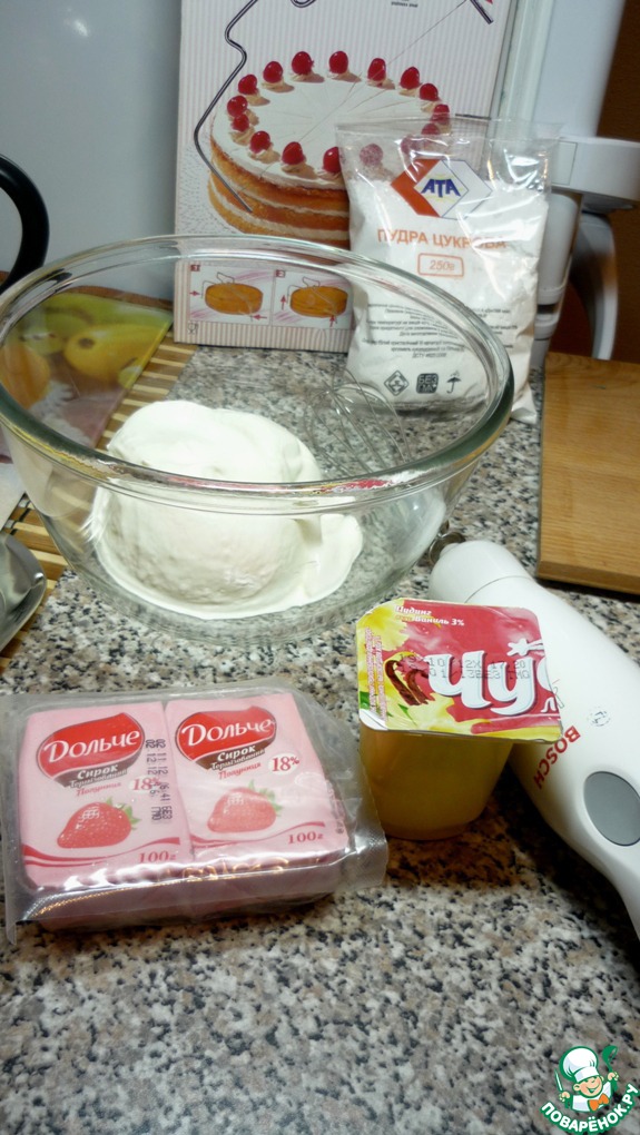 Теперь приступаем к крему, паралельно варим и остужаем пропитку для бисквита. В данном случае для крема я использовала сметану 30% +пудинг+творожки+сах арную пудру, всё взбить блендером до однородной массы, пропитка - сахарный сироп