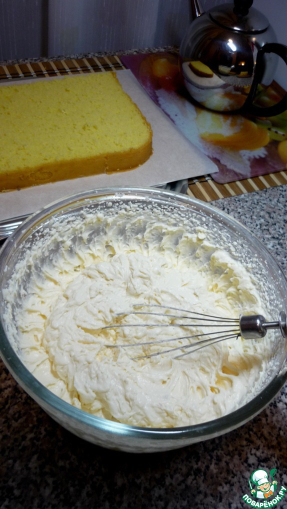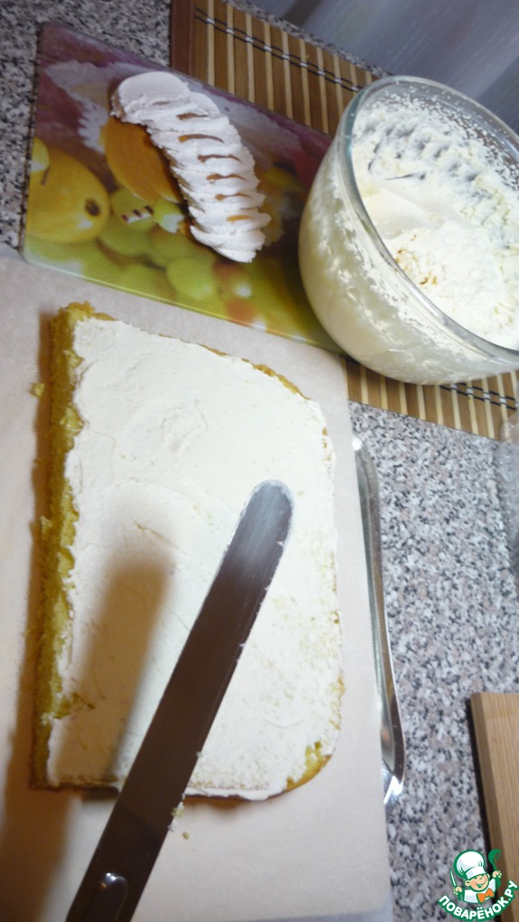 ... пропитываем бисквит и тонким слоем смазываем кремом...