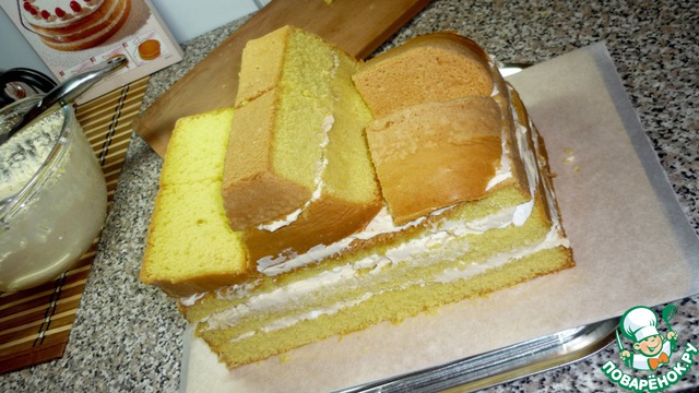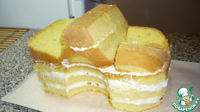 Условно делим бисквит на три части и ТРЕТЬЮ часть отрезаем...