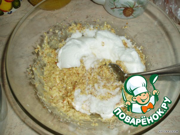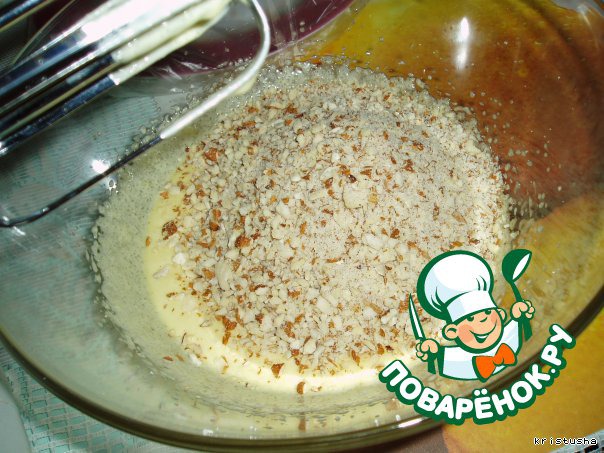 Для начала возьмите 130г орехов и размелите в комбайне. Все продукты должны быть комнатной температуры. 50г масла взбейте в сахар. Добавьте три желтка,