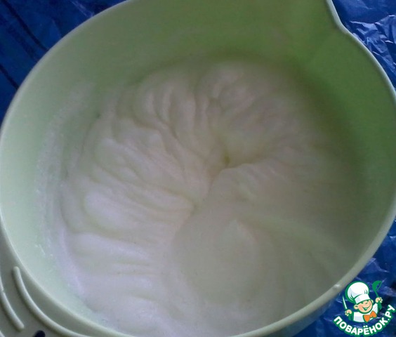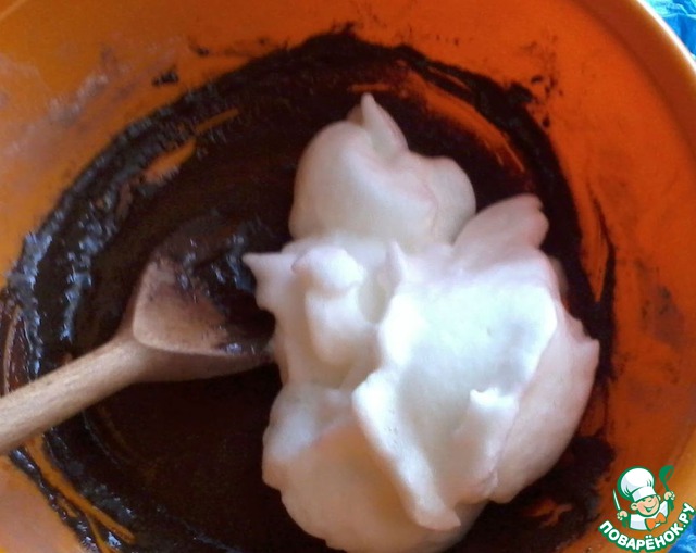 К этой массе добавить частями половину белков, все время хорошо размешивать.
