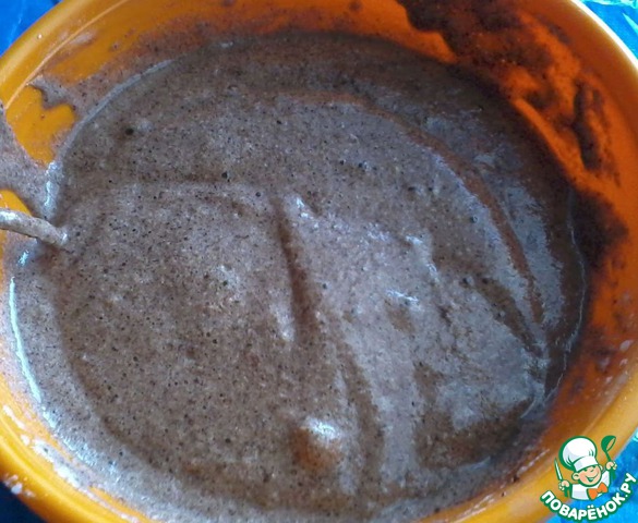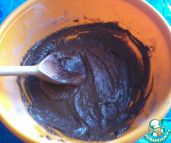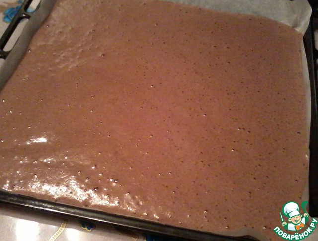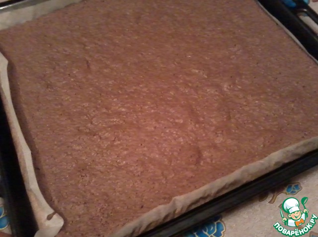 Тесто выливаем в форму с пекарской бумагой и небольшими бортиками и ставим в заранее разогретую духовку - темп.190 С.