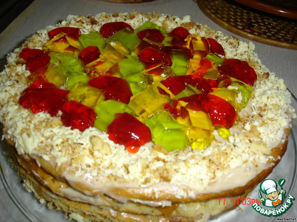 | Есть у меня дежурный рецепт тортика, который меня часто выручает. Его достоинство в том, что тесто я делаю вечером, оставляю на ночь в холодильнике, а на следующий день его выпекаю. При хроническом отсутствии свободного времени это очень помогает. Веселенький тортик я делала в жаркое время, поэтому вместо крема сделала разноцветное фруктовое желе: и глаз радует, и для желудка облегчение. |