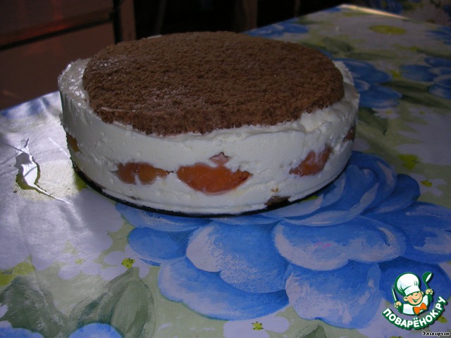7. На один корж поставить бортик от разъемной формы. Выложить половину крема, на него персики (сок хорошо слить)