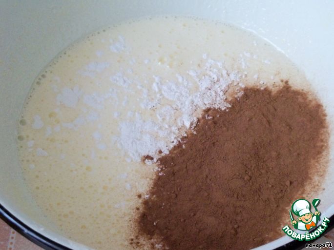 Яйца взбить с сахаром в крутую пену, добавить разрыхлитель и какао, размешать. Сливочное масло растопить и смешать с молоком.