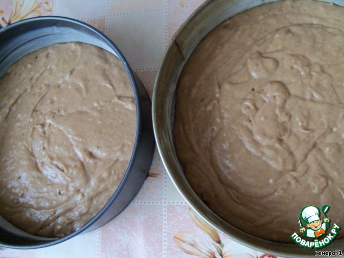 Колличество продуктов дано на два коржа 22 и 24 см. Оба коржа необходимо выпекать вместе, если у Вас мало места в духовке для двух форм, то надо замесить тесто в 2 приема, разделив продукты пополам.
