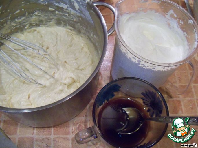 К маскарпоне добавить сахарную пудру, желатиновое кофе, хорошо взбить. Отдельно взбить сливки и добавить к маскарпоне, перемешать.