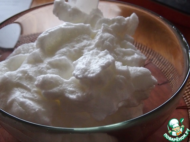 Белки отделить от желтков. Взбить белки со щепоткой соли до крепких пиков, переложить в сухую миску до дальнейшего использования.