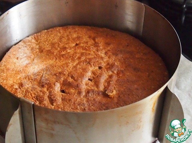 Полученную массу выложить в форму и поставить выпекать на 30-35 минут. Готовность проверить деревянной шпажкой или спичкой. У нас получился вот такой пирог, который мы оставляем остывать прямо в форме. Через 10 минут пирог вынуть из формы и полностью остудить.