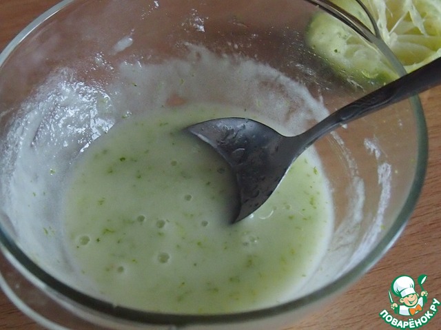 Готовим глазурь. Сахарную пудру смешать с цедрой одного лайма и двумя столовыми ложками сока лайма. Сока может понадобить немного больше, в зависимости от того, насколько густую глазурь вы хотите получить.