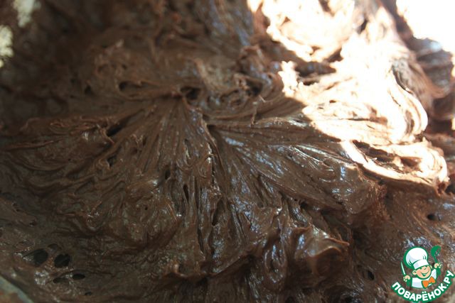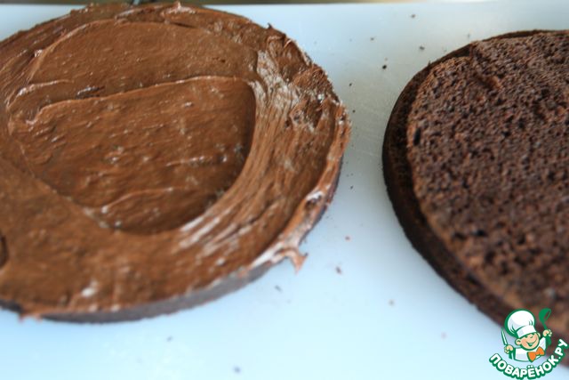 Включаем духовку на 180С и оставляем нагреваться. Вообще торт в оригинале идет из двух коржей и выпекается в двух формах по 20см. У меня здесь только одна форма 25 см. я выпекала все сразу в одной и разрезала корж на три части. Раньше я его готовила в двух формах и разделяла каждый корж, получалось четыре уровня. Крема для этого торта идет много, так что вполне достаточно промазать все, но это кто как любит! И так форму смазываем маслом и присыпаем ее какао-порошком.