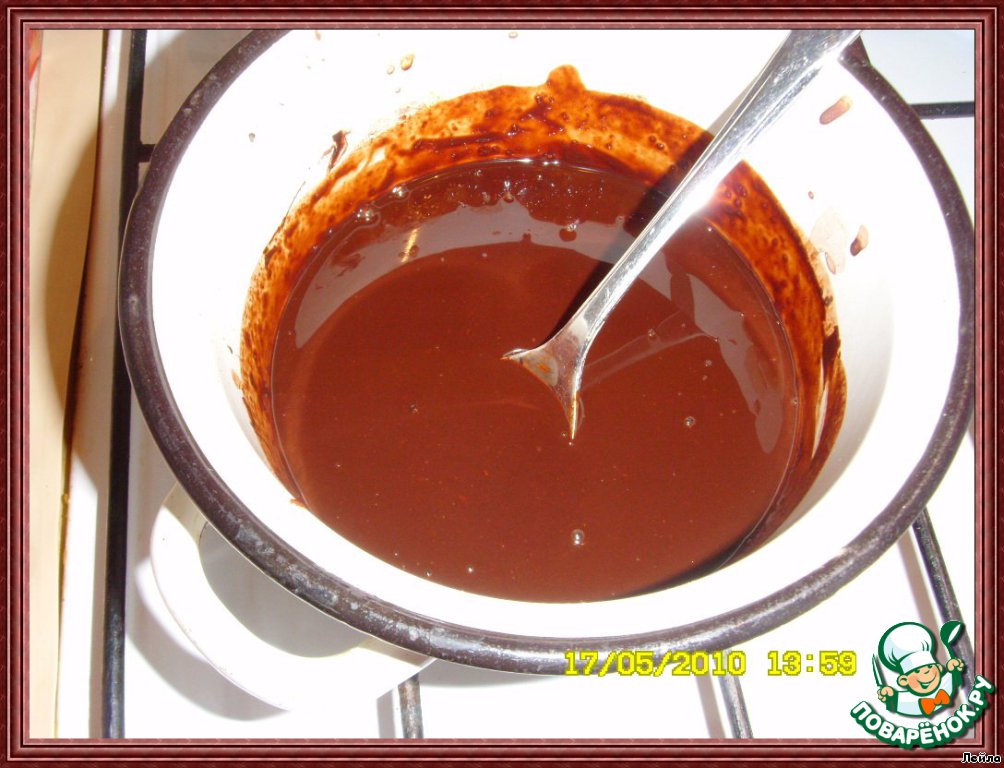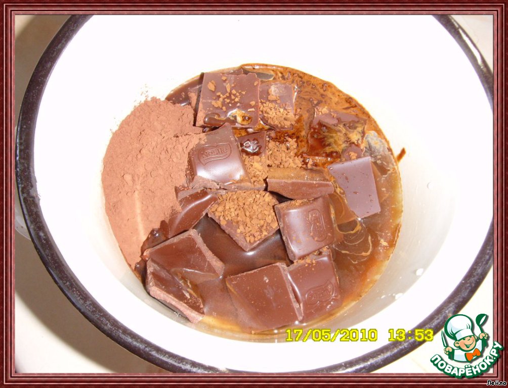 [b]Коржи.[/b] В кастрюльке смешать нарубленный шоколад с кофе, какао и водой.