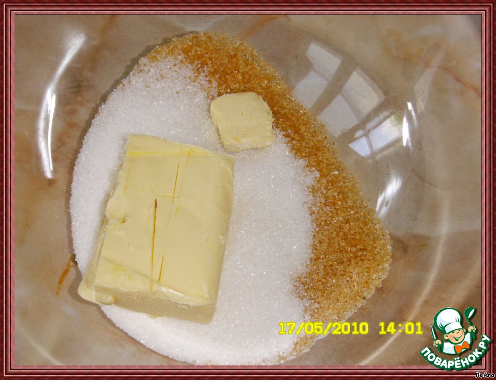 Взбить масло с коричневым и белым сахаром в пышную массу.
