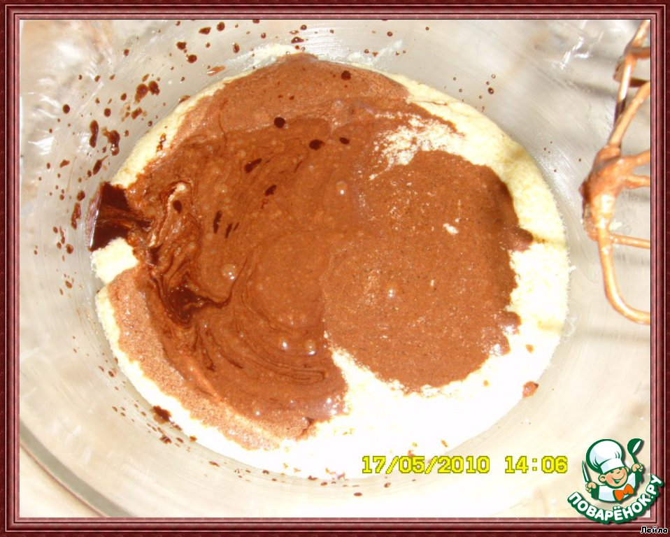 Продолжая взбивать на низких оборотах, влить шоколадную массу.