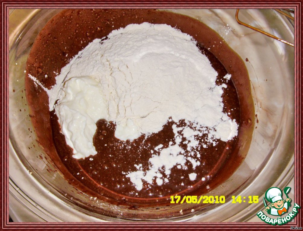 Просеять муку с разрыхлителем, содой и солью. Добавить в общую массу в 3 приёма, чередуя с йогуртом.