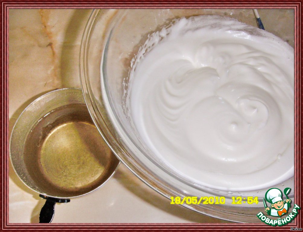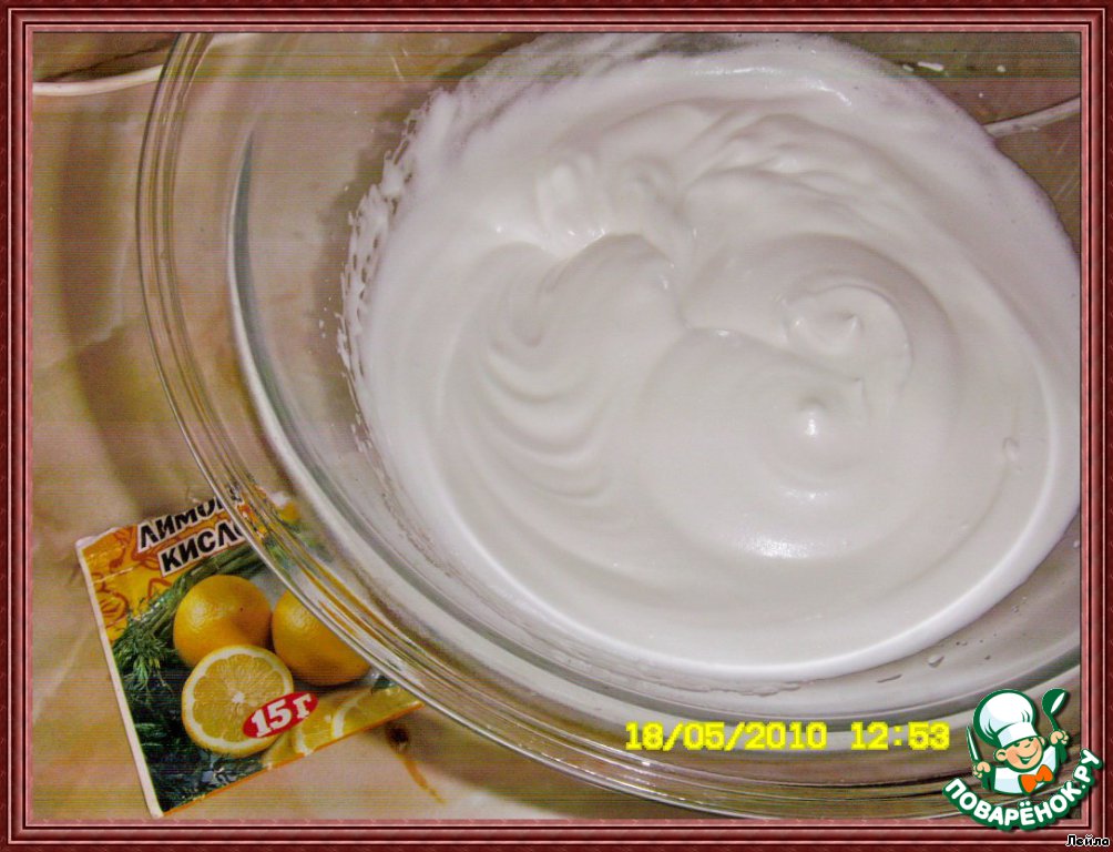 Взбить белки с винным камнем(или лимонная кислота), постепенно добавляя 3 ст.л. сахара.