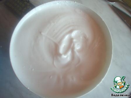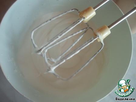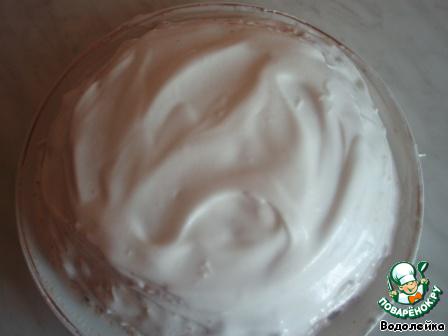Пока сироп варится, взбить в густую пену 3 белка. Готовый сироп (сразу с огня!!!!) тонкой струйкой вливать в белки, при этом постоянно продолжать взбивать. И продолжать взбивать еще пару минут после введения всего сиропа. Это у нас получился белковый заварной крем.