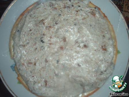 Начинаем сборку торта. На блюдо кладем первый корж и покрываем его половиной фруктово-орехового крема. Сверху второй корж, его намазать остальной половиной крема.
