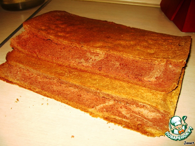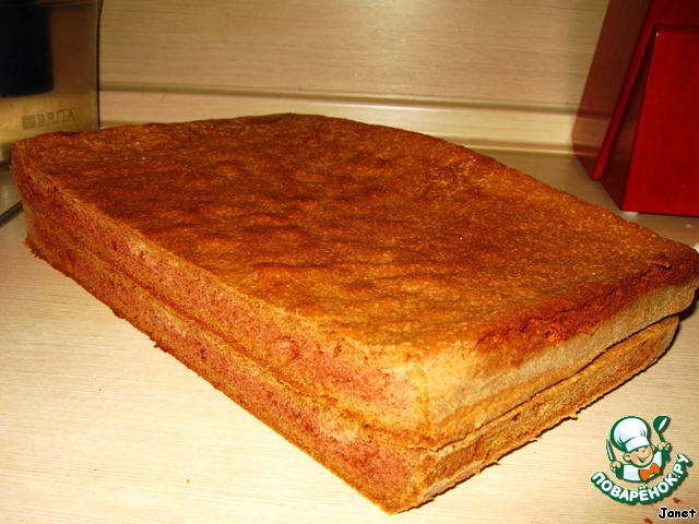 Каждую заготовку разрезать вдоль, получатся четыре коржа.